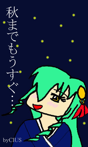 (2001/8/20)(44KB) CIUSさんから暑中見舞いを頂きました。 浴衣を着たホーネットが、涼しげでいい感じです。 実は、2週間ほど前に頂いたんですが、こちらの不手際で 今日の掲載となりました。大変申し訳ございません。 このCGを贈ってくださったCIUSさんのホームページはこちらです。 (閉鎖なされたようです・・・) |